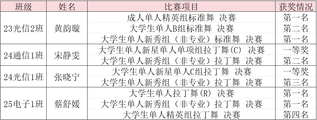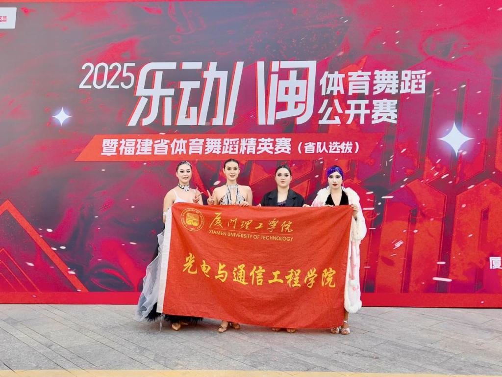 2026年1月10日,2025“乐动八闽”体育舞蹈公开赛暨福建省体育舞蹈精英赛在厦门圆满落幕。光电学子23光信2班黄韵璇、24通信1班宋静雯、24光信1班张晓宁、25电子1班蔡舒媛代表学校出战,在全省众多优秀选手的激烈角逐中,凭借扎实的功底与出色的舞台表现脱颖而出,斩获多项大奖,尽显光电学子的青春风采与昂扬斗志。